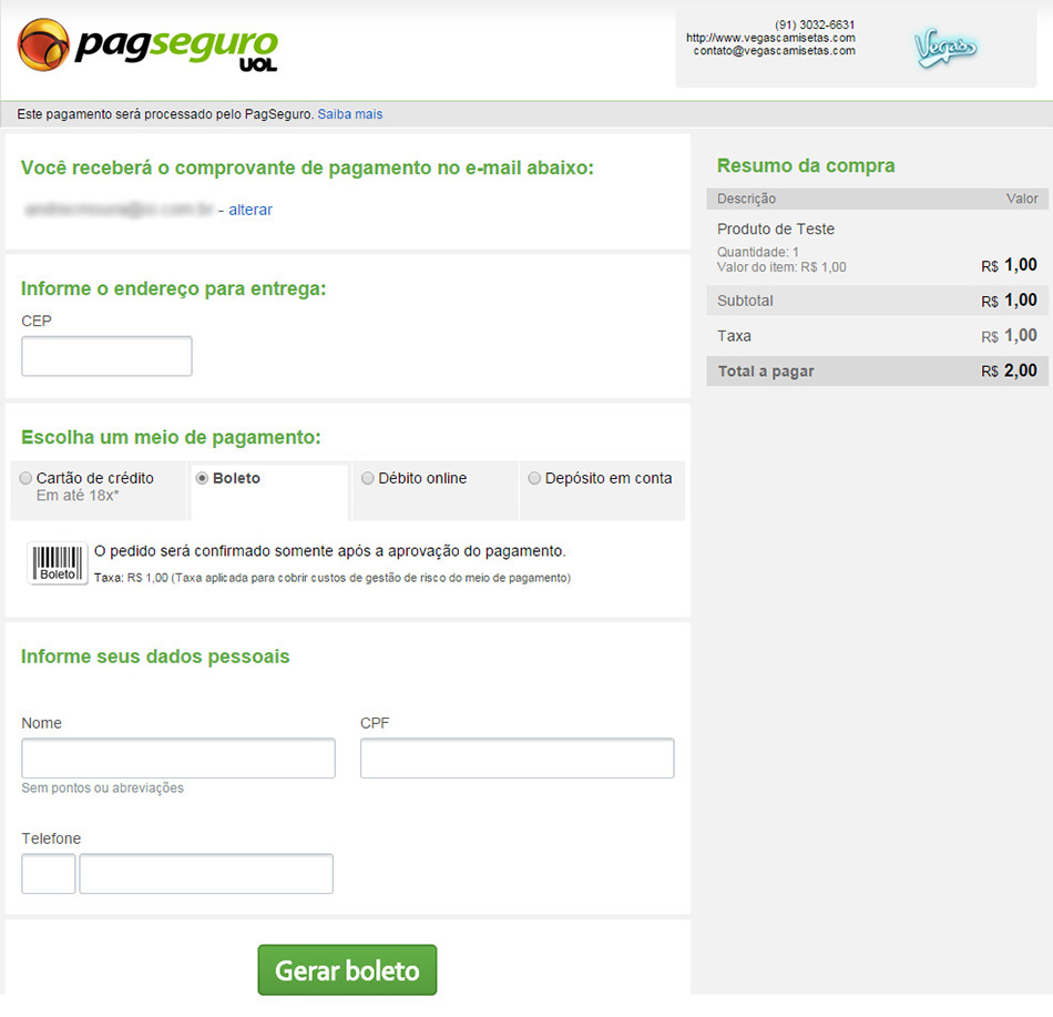 Nossa loja utiliza o PagSeguro como forma de pagamento, ou seja, você não precisa inserir nenhum tipo de informação de pagamento na nossa loja, visto que todo e qualquer pagamento é realizado dentro do ambiente do próprio PagSeguro.